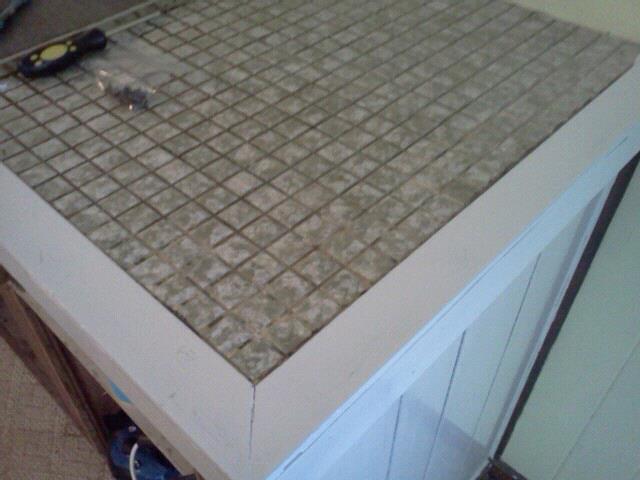 A close up of the bar top before and after. The green tile is not my favorite but painting the walls green definitely helps. And the white bar made the room so much lighter.